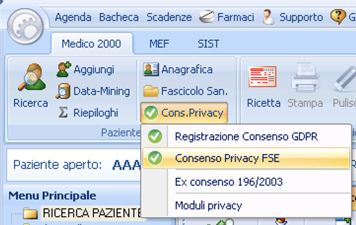 All'apertura di un paziente, sul menu Privacy è stato aggiunto Consenso Privacy FSE.