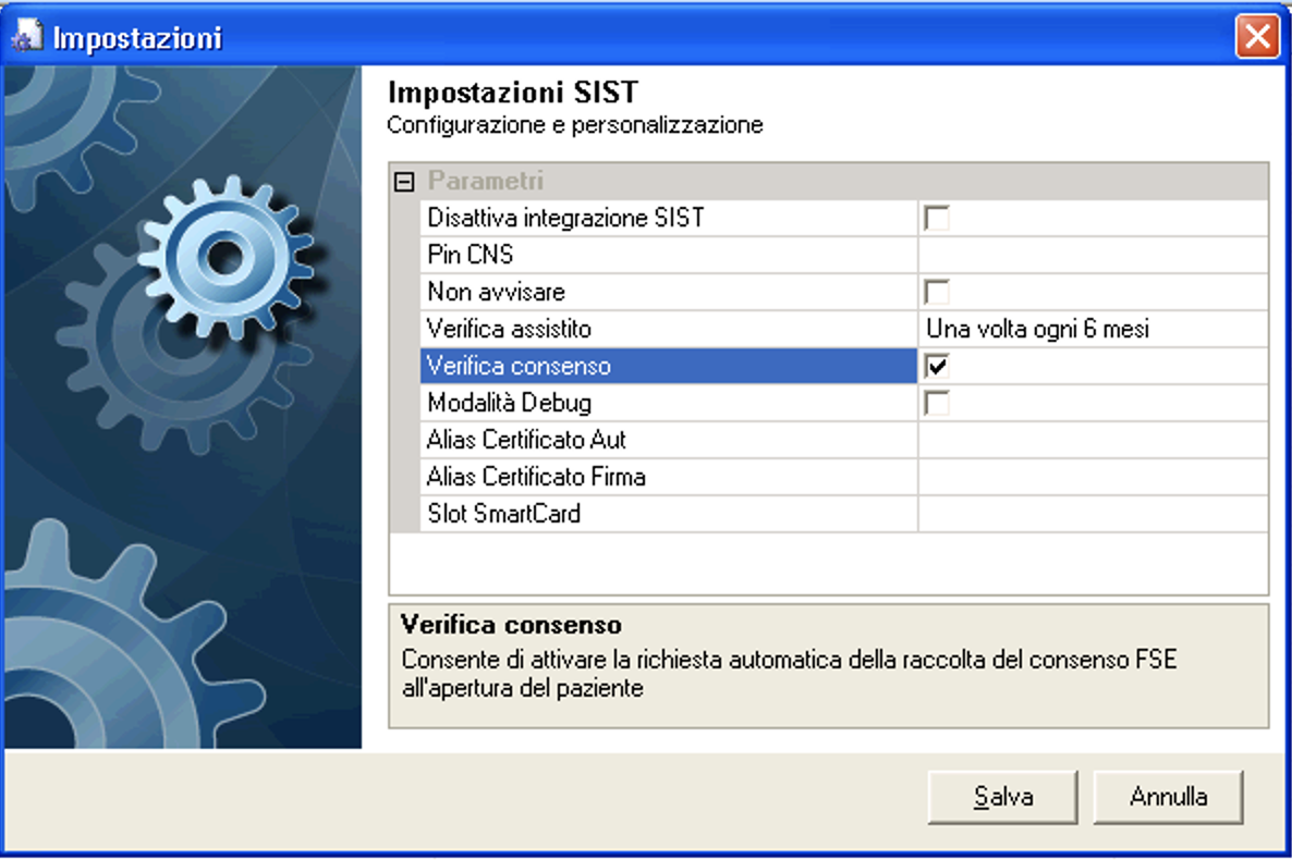 Se si desidera verificare il consenso all’apertura del paziente in modo automatico è possibile impostare l’automatismo andando in alto alla voce SIST - > Imposta - > Impostazione e biffare la voce Verifica consenso come nell’immagine che segue:
